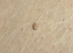 一位43歲女性,在右腹股溝處發現突出一顆吊鐘狀小腫塊,原先不以為意,後來因局部腫痛而就醫。檢查發現是贅生皮經摩擦導致皮膚破損,進而傷口發炎,經治療後痊癒。 62歲男性左頸部皮膚有一小腫塊,自行塗抹藥物後,出現皮膚腫痛而就醫,檢查發現為贅生皮經局部塗抹酸性藥劑造成皮膚化學灼傷,治療後痊癒。